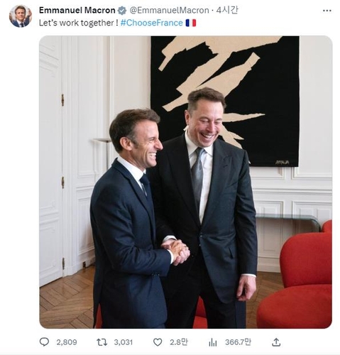 마크롱 대통령은 전날 기자들과 만나 머스크와 "AI와 소셜미디어, 우리 아이들을 보호하기 위한 소셜미디어(SNS) 규제 틀에 관한 이야기와 자동차, 배터리에 관해서 이야기할 예정이라고 밝혔다.