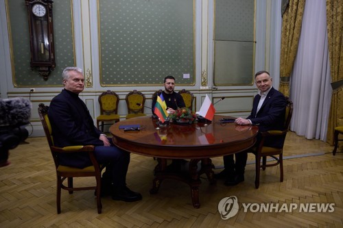 (베를린=연합뉴스) 이율 특파원 = 안제이 두다 폴란드 대통령과 기타나스 나우세다 리투아니아 대통령이 28일(현지시간) 우크라이나 키이우에서 볼로디미르 젤렌스키 우크라이나 대통령을 만나 우크라이나의 북대서양조약기구(NATO·나토)와 유럽연합(EU) 가입에 지지를 표명했다고 로이터통신과 폴란드PAP통신 등이 전했다.