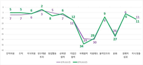 특히 세부 지표인 국내총생산(GDP) 대비 해외 투자와 외국인 투자 비중이 이 기간 15위에서 24위까지 떨어진 영향이 컸다고 KISTEP은 설명했다.