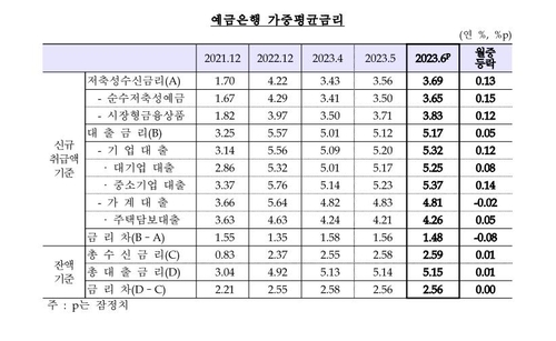 신규 취급 기준이 아닌 잔액 기준 예대금리차(2.56%p)는 5월 수준과 같았다.