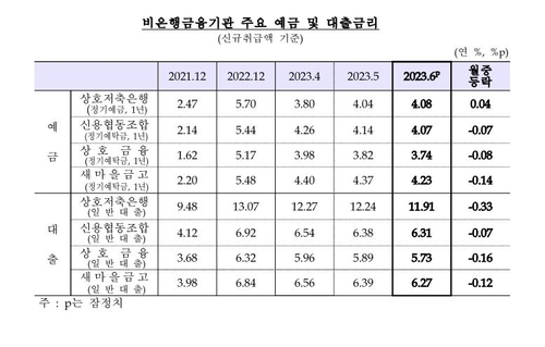 은행 외 금융기관들의 예금 금리는 상호저축은행(1년 만기 정기예탁금 신규취급액 기준·4.08%)만 0.04%p 올랐고, 나머지 신용협동조합(4.07%), 상호금융(3.74%), 새마을금고(4.23%)에서 각 0.07%p, 0.08%p, 0.14%p 하락했다.