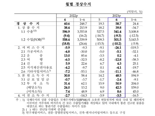 다만 올해 들어 6월까지 상반기 누적 경상수지는 24억4천만달러로, 작년 같은 기간(248억7천만달러)과 비교해 약 90%나 급감한 상태다.