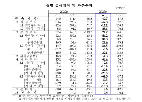 금융계정 순자산(자산-부채)은 6월 중 47억7천만달러 불었다.