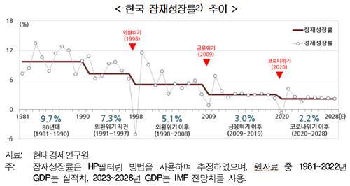 현대경제연구원은 메가쇼크(거대 충격) 이후 잠재성장률이 급락하는 한국 경제의 특성으로 인해 외환위기 직전(1991∼1997년) 7.3%에 달했던 우리 경제 잠재성장률이 외환위기 이후(1998∼2008년) 5.1%, 금융위기 이후(2009∼2019년) 3.0%, 다시 코로나 위기 이후(2020∼2028년) 2.2%까지 떨어진 것으로 분석했다.