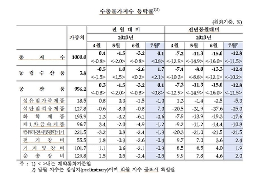 한은 경제통계국 물가통계팀 유성욱 팀장은 "7월 수출 물가는 유가 상승 등 영향으로 석유제품 가격 등이 오르며 상승했다"면서 "전년 동월 대비로는 석유제품 가격이 내리고 반도체 중심으로 정보기술(IT) 제품 가격도 하락하면서 떨어졌다"고 설명했다.