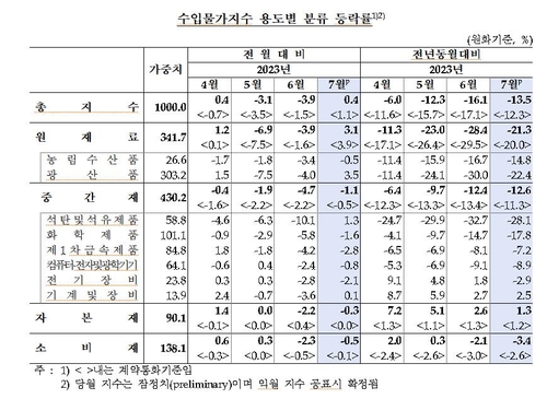 수입물가지수 역시 5월(-3.1%)과 6월(-3.9%) 큰 폭으로 하락했다가 7월 상승세로 돌아섰다.
