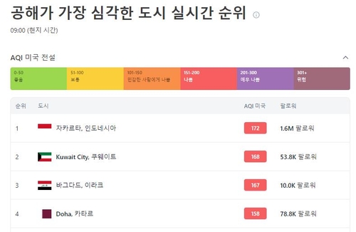 22일(현지시간) 스위스에 본부를 둔 글로벌 대기질 분석업체 아이큐에어(IQAIR)에 따르면 이날 오전 9시 기준 자카르타의 공기질지수(AQI)는 172를 기록, 전 세계 주요 도시에서 대기질이 가장 나쁜 것으로 나타났다. 같은 시간 서울은 72였다.