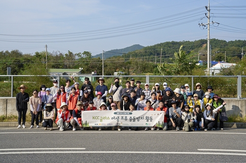 ▲ KCC글라스는 지난 9일 충남 서천군 일대에서 야생조류를 방음벽으로부터 보호하기 위한 충돌 방지 스티커 부착 활동을 진행했다고 12일 밝혔다. 봉사활동에는 임직원들로 구성된 '홈씨씨 챌린저 봉사단'과 유튜버 새덕후, 국립생태원, 이화여대 소모임 '윈도우스트라이크 모니터링' 등 60여명이 참여했다. 조류 충돌방지 스티커를 투명한 장애물에 부착하면 조류가 통과할 수 없는 것으로 인식해 사고율이 90% 가량 낮아진다. (서울=연합뉴스)