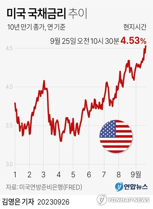 (뉴욕=연합뉴스) 이지헌 특파원 = 25일(현지시간) 글로벌 채권 금리의 벤치마크 역할을 하는 10년 만기 미 국채 금리가 연 4.5%를 넘어서며 16년 만의 최고치를 다시 경신했다.