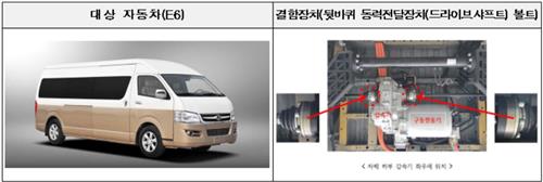 이비온 E6 230대는 뒷바퀴 동력전달장치(드라이브 샤프트) 볼트 체결에 불량이 나타났으며, 70대는 전원공급 커넥터 조립 불량으로 주행 중 동력 상실 가능성이 확인돼 오는 12일부터 리콜된다.