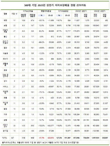 10일 기업 경영분석 연구소 리더스인덱스가 매출 상위 500대 기업 중 올해 상반기 사업보고서를 제출한 347개 기업의 이자보상배율을 조사한 결과 1.16으로 작년 상반기의 4.42 대비 3.26포인트(74%) 떨어졌다.