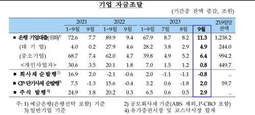 가계대출이 아닌 예금은행의 9월 기업 대출 잔액(1천238조2천억원)도 한 달 새 11조3천억원 또 늘었다.