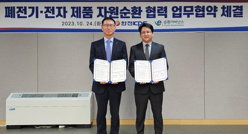 (서울=연합뉴스) 이슬기 기자 = 발전·송전설비 정비 전문회사인 한전KPS는 24일 E-순환거버넌스와 폐전기·전자 제품 재활용 활성화를 위한 업무협약을 체결했다.