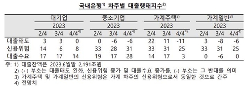 지수가 음수(-)면 '(신용위험·대출수요) 증가' 또는 '(대출태도) 완화'라고 답한 금융기관 수가 '감소' 또는 '강화'보다 적었다는 뜻이다