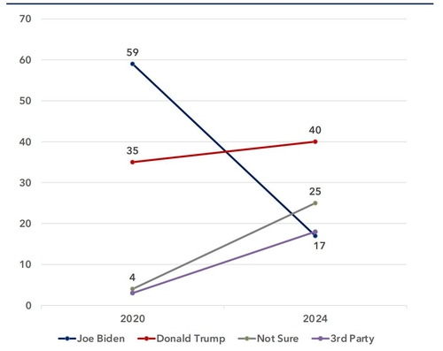 바이든 대통령에 대한 아랍계 미국인의 지지는 2020년(59%)에 비해 42%포인트나 준 수치라고 이 연구소는 밝혔다. 트럼프 전 대통령에 대한 지지는 2020년에 비해 5%포인트가, 제3 후보(케네디·웨스트)에 대한 지지는 2020년에 비해 13%포인트가 각각 늘었다.