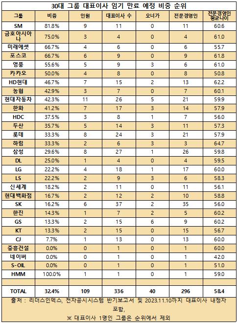 그룹별로 보면 SM그룹의 CEO 11명 중 9명이 내년 3월 또는 4월에 임기가 끝나 임기 만료를 앞둔 CEO 비율이 가장 높았다.