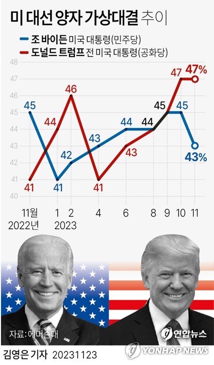 에머슨대가 이달 17~20일 전국 1천475명의 미국 등록 유권자를 대상으로 실시해 22일(현지시간) 공개한 여론조사(오차범위 ±2.5%P)에 따르면 양자 가상대결에서 바이든 대통령은 43%, 트럼프 전 대통령은 47%를 각각 기록했다.