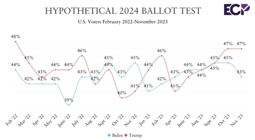 바이든 대통령은 직전 10월 조사에서 45%를 기록했다가 이번에 2%포인트 하락했으며 트럼프 전 대통령의 지지율은 변동이 없었다.