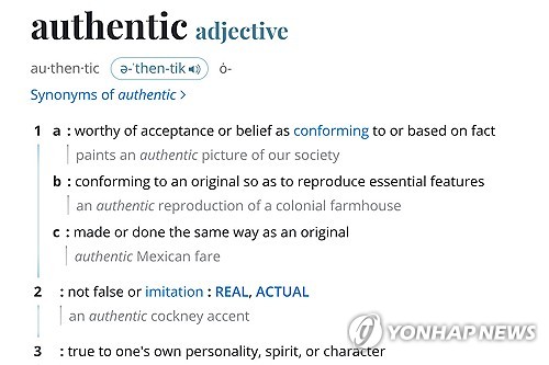(서울=연합뉴스) 권수현 기자 = '진짜의', '진품의'라는 의미의 영어 단어 '어센틱'(authentic)이 미국 유명 사전 출판사 메리엄웹스터의 2023년 '올해의 단어'로 선정됐다고 27일(현지시간) AP통신이 보도했다.