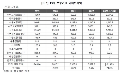 13개 보증기관(주택도시보증공사·주택금융공사·서울보증보험·서민금융진흥원·신용보증기금·지역신용보증재단·기술보증기금·수출입은행·산업은행·중소기업은행·한국무역보험공사·해양진흥공사·한국자산관리공사) 중 대위변제액이 가장 많이 늘어난 곳은 주택도시보증공사였다.