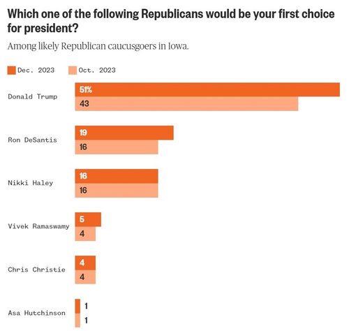 미국 NBC 방송이 지난 2~5일 502명의 아이오와주 공화당 코커스(당원대회) 참석 예상자를 대상으로 실시해 11일(현지시간) 공개한 여론조사에 따르면 트럼프 전 대통령은 51%의 지지율로 압도적인 1위를 기록했다.