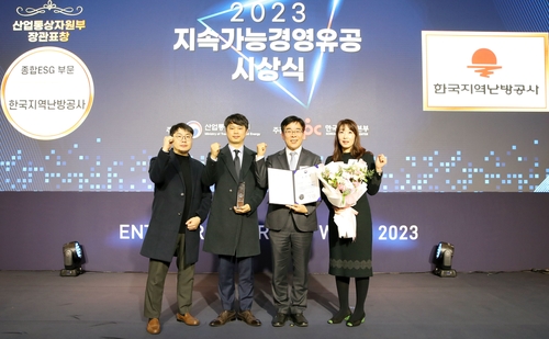 ▲ 한국지역난방공사는 지난 14일 산업통상자원부와 중소벤처기업부 주최로 열린 '2023 지속가능경영 유공 정부 포상' 시상식에서 산업통상자원부 장관 표창을 받았다고 15일 밝혔다. 한국지역난방공사는 국내 최초 '열에너지 저탄소 제품 인증' 획득 등 탄소 저감 및 환경 개선 노력을 인정받아 표창 대상으로 선정됐다. 정용기 사장은 "깨끗한 에너지로 세상을 따뜻하게 만드는 공기업으로서 앞으로도 지속가능한 경영을 위해 노력해 나가겠다"고 말했다. (서울=연합뉴스)