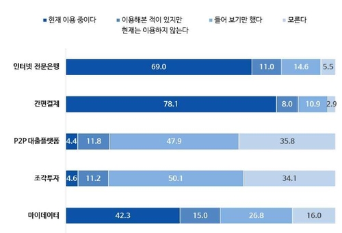 (서울=연합뉴스) 민선희 기자 = 온라인투자연계금융업(P2P·온투업)과 조각투자의 경우 인지도에 비해 이용률이 저조한 것으로 조사됐다.