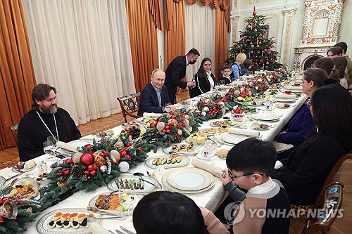 (서울=연합뉴스) 임지우 기자 = 오는 3월 대통령 선거를 앞둔 블라디미르 푸틴 러시아 대통령이 우크라이나 전쟁 전사자 가족을 초청해 성대한 성탄 전야 만찬을 열었다고 영국 일간 텔레그래프가 7일(현지시간) 보도했다.
