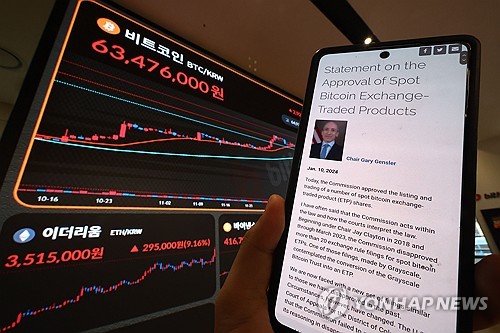 (서울=연합뉴스) 미국 증권거래위원회(SEC)가 10일(현지시간) 11개 비트코인 현물 상장지수펀드(ETF)의 거래소 상장 및 거래를 승인했다. 비트코인 현물 시세 등락에 연동해 가격이 변동하는 금융투자 상품으로, 결과적으로 가상자산의 대장주인 비트코인이 제도권에 진입해 공인 투자자산으로 인정받은 셈이다. 이전에 출시된 비트코인 선물 ETF가 파생상품 성격이 강한 것과 달리 현물 ETF는 증권거래소에서 주식처럼 사고팔 수 있어 매매 접근성에서 차원이 다르다. 시가총액 2위인 이더리움 등 다른 가상자산 현물 ETF의 출시도 잇따를 전망이다.