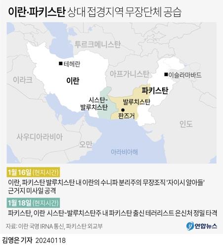 (서울=연합뉴스) 신유리 기자 = 이란이 18일(현지시간) 접경국 파키스탄의 맞불 공습에 "용납 못한다"고 다시 경고장을 날리면서 불과 이틀 만에 '보복에 보복'을 주고받는 분쟁 국면으로 전환됐다.