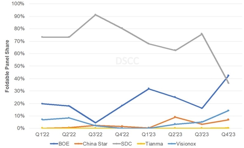 30일 시장조사업체 디스플레이서플라이체인컨설턴트(DSCC)에 따르면 삼성디스플레이의 폴더블 OLED 시장 점유율은 작년 3분기 76%에서 4분기 36%로 떨어져 2021년 1분기 이후 최저 수준을 기록했다.