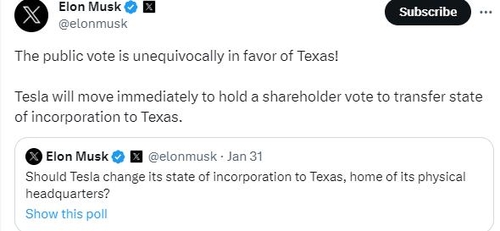 머스크는 지난 31일 자신의 소셜미디어 엑스(X·옛 트위터)에 팔로워를 대상으로 테슬라의 법인 소재지 이전 여부에 관해 물었고, 110만명이 참가한 투표에서 87%가 "찬성한다"고 답했다.