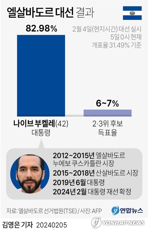 엘살바도르 선거법원(TSE)에 따르면 부켈레 대통령은 이날 밤 12시 현재, 개표율 31.49% 기준 82.98%의 득표율을 기록했다. 다른 5명 후보 중 2·3위 득표율은 6∼7%대에 그쳤다.