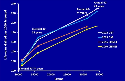 ◆ 출처 : Radiology, Debra L. Monticciolo et al., 'Outcomes of Breast Cancer Screening Strategies Based on Cancer Intervention and Surveillance Modeling Network Estimates', https://pubs.rsna.org/doi/10.1148/radiol.232658