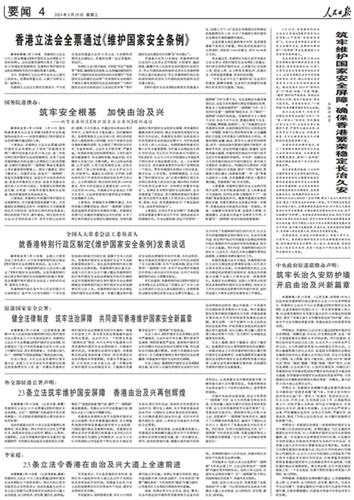 중국공산당 기관지 인민일보는 20일자 신문 한 면을 통째로 할애해 전날 홍콩 입법회가 만장일치로 기본법 23조 입법을 마친 사실을 비롯해, 국무원(중앙정부), 전국인민대표대회(전인대·국회 격), 국가안전부, 외교부 등 홍콩에 주재 사무소를 둔 기관의 환영 입장, 자사 논평 등을 전했다.
