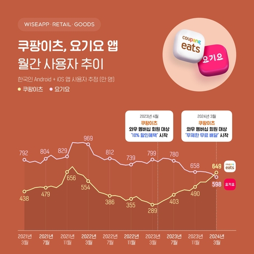 와이즈앱은 쿠팡이츠가 지난해 4월 와우 멤버십 회원에게 '10% 할인 혜택'을 제공한 뒤 요기요와 사용자 수 차이를 크게 좁혔고, 지난달 26일에는 와우 멤버십 회원을 대상으로 무제한 무료 배달 서비스를 시작한 뒤 배달앱 2위로 올라서게 됐다고 분석했다.