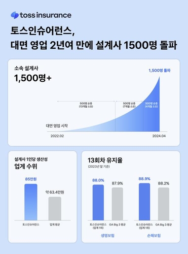 (서울=연합뉴스) 홍국기 기자 = 비바리퍼블리카의 법인보험대리점(GA) 자회사 토스인슈어런스는 소속 설계사가 1천500명을 돌파했다고 24일 밝혔다.