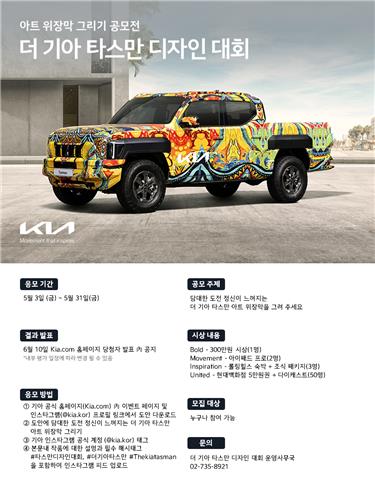 (서울=연합뉴스) 임성호 기자 = 기아[000270]는 브랜드 첫 픽업트럭인 '더 기아 타스만'의 아트 위장막을 그려보는 '타스만 디자인 대회'를 개최한다고 3일 밝혔다.