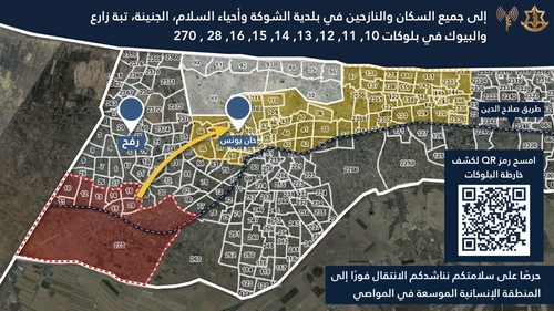 아비하이 아드라이 이스라엘군 아랍어 대변인은 이날 소셜미디어 엑스(X)에 해안에 있는 알마와시의 '인도주의 구역'을 확대한다면서, 라파 동부에 머무는 주민들에게 이곳으로 대피하라고 촉구했다.
