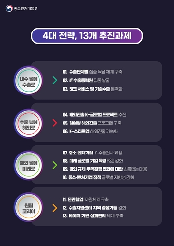 중기부는 ▲ 내수 넘어 수출로 ▲ 수출 넘어 해외로 ▲ 해외 넘어 미래로 ▲ 원팀코리아 등 4대 전략에 따라 13개 세부 과제를 추진한다.