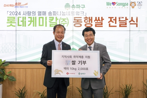 ▲ 롯데케미칼[011170]은 가정의 달을 맞아 10㎏ 쌀 2천포를 서울 송파구청에 기부했다고 8일 밝혔다. 기부된 쌀은 송파구에 거주하는 취약계층과 사회복지관에 전달된다. 이훈기 총괄대표는 "다양한 지원활동을 통해 힘든 상황에 있는 이웃에 대한 책임과 역할을 지속해 확대하겠다"고 말했다. (서울=연합뉴스) (끝)