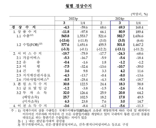 상품 80.9억달러 흑자…여행 -10.7억달러 등 서비스 -24.3억달러