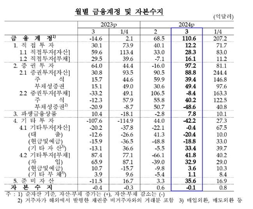 증권투자에서는 내국인의 해외투자가 채권을 중심으로 88억8천만달러 확대됐다. 반대로 외국인의 국내 투자는 채권 위주로 8억4천만달러 감소했다.