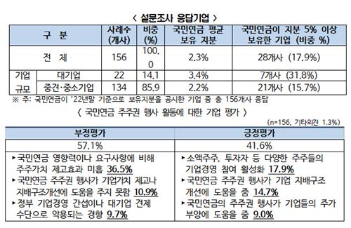 응답 기업의 36.5%는 '국민연금의 영향력이나 요구사항에 비해 주주가치 제고 효과가 미흡하다'고 평가했고, 10.9%는 '국민연금 주주권 행사가 기업가치 제고나 지배구조 개선에 도움을 주지 못한다'고 답했다.