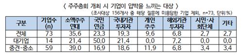 주총을 앞두고 가장 큰 압박을 주는 대상을 묻자 응답 기업 중 대기업은 국민연금(50%)을, 중견·중소기업은 소액주주연대(39%)를 우선으로 꼽았다.