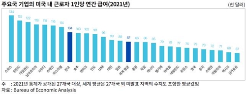 미국 내 외국계 기업의 고용 창출 비중은 한국이 1.1%로 영국(15.4%), 일본(12.1%), 독일(11.6%) 등보다 크게 낮았지만, 근로자 1인당 연간급여는 한국 기업이 평균 10.4만달러로, 전체 평균(8.7만달러)보다 높았다.