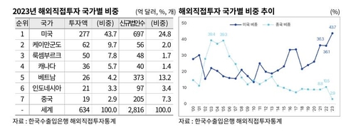 (서울=연합뉴스) 김동규 기자 = 지난해 한국의 해외직접투자(ODI)에서 미국이 차지하는 비중이 43.7%로 지난 1988년 이후 최고치를 기록한 것으로 나타났다.