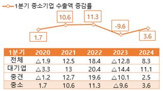 1분기 중소기업 수출 증가율은 우리나라 전체 수출(8.3%), 대기업 수출(11.1%)보다 낮았다.
