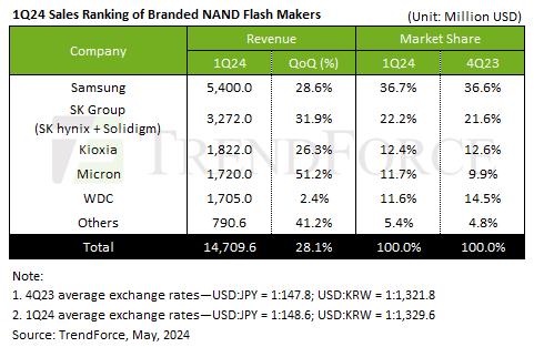 29일 대만 시장조사업체 트렌드포스에 따르면 1분기 전 세계 낸드 매출은 작년 4분기보다 28.1% 증가한 147억960만달러를 기록했다.