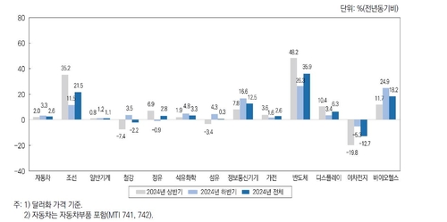 이어 조선(21.5%), 바이오헬스(18.2%), 디스플레이(6.3%), 가전(2.6%) 등 대부분 업종의 수출도 증가하겠지만, 업황 부진 등으로 철강과 이차전지 수출만 전년보다 2.2%, 12.7% 감소할 것으로 예상됐다.